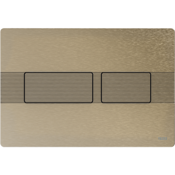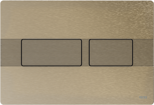 Bedieningsplaat met gestructureerd oppervlak voor TECE-spoelkast voor front- of planchetbediening. Zeer vlakke roestvrijstalen bedieningsplaat met bedieningstoetsen die voorzien zijn van een rubberen stootrand, inclusief bedieningsstangen en bevestigingsmateriaal. Bedieningsplaat met onzichtbare schroeven.