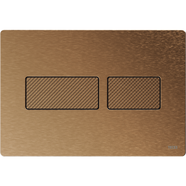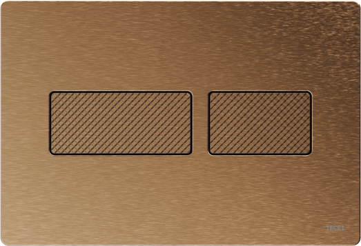 Bedieningsplaat met gestructureerd oppervlak voor TECE-spoelkast voor front- of planchetbediening. Zeer vlakke roestvrijstalen bedieningsplaat met bedieningstoetsen die voorzien zijn van een rubberen stootrand, inclusief bedieningsstangen en bevestigingsmateriaal. Bedieningsplaat met onzichtbare schroeven.