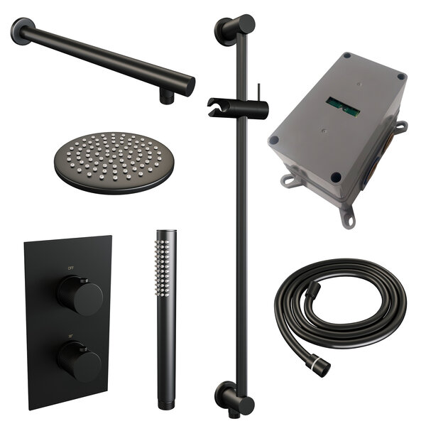 Brauer Black Carving Regendoucheset: Thermostatische Inbouwkraan met 3-Weg Omstel, Rechte Wandarm, Douchekop 20cm, Glijstang met Wateruitlaat, Staafhanddouche & Doucheslang - Set 37 - Geribbeld Draaiknoppen - Mat Zwart