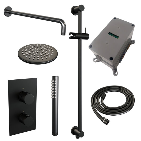Brauer Black Carving Regendoucheset: Thermostatische Inbouwkraan met 3-Weg Omstel, Gebogen Wandarm, Douchekop 20cm, Glijstang met Wateruitlaat, Staafhanddouche & Doucheslang - Set 39 - Geribbeld Draaiknoppen - Mat Zwart