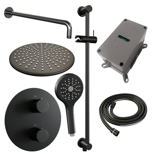 Brauer Black Edition Regendoucheset: Thermostatische Inbouwkraan met 3-Weg Omstel, Gebogen Wandarm, Douchekop 30cm, Geintegreerde Glijstang, 3-Standen Handdouche & Doucheslang - Set 94 - Draaiknoppen - Mat Zwart