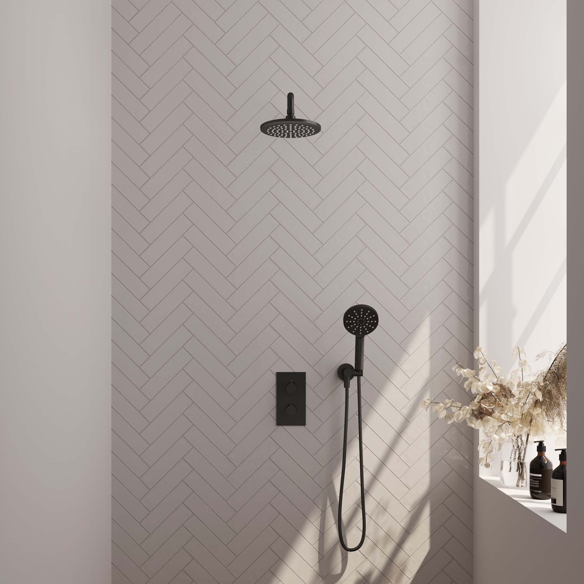 Brauer Black Editon Regendoucheset: Thermostatische Inbouwkraan met 3-Weg Omstel, Gebogen Wandarm, Douchekop 20cm, Wandhouder met Wateruitlaat, 3-Standen Handdouche & Doucheslang - Set 33 - Draaiknoppen - Mat Zwart