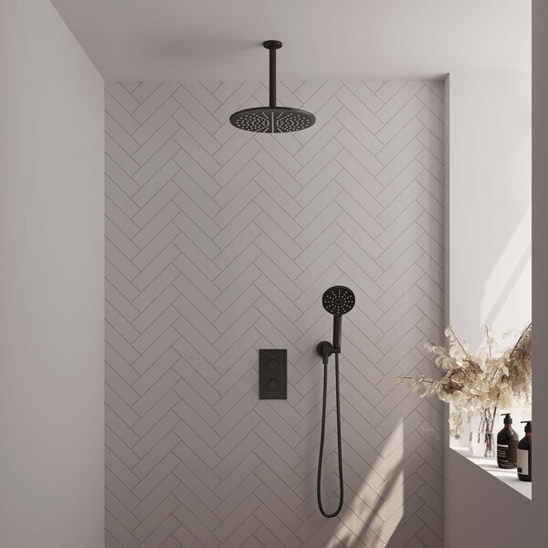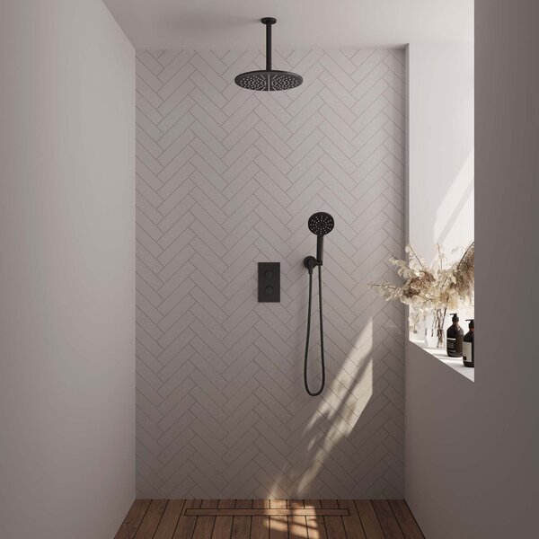 Brauer Black Editon Regendoucheset: Thermostatische Inbouwkraan met 3-Weg Omstel, Plafondarm, Douchekop 30cm, Wandhouder met Wateruitlaat, 3-Standen Handdouche & Doucheslang - Set 36 - Draaiknoppen - Mat Zwart
