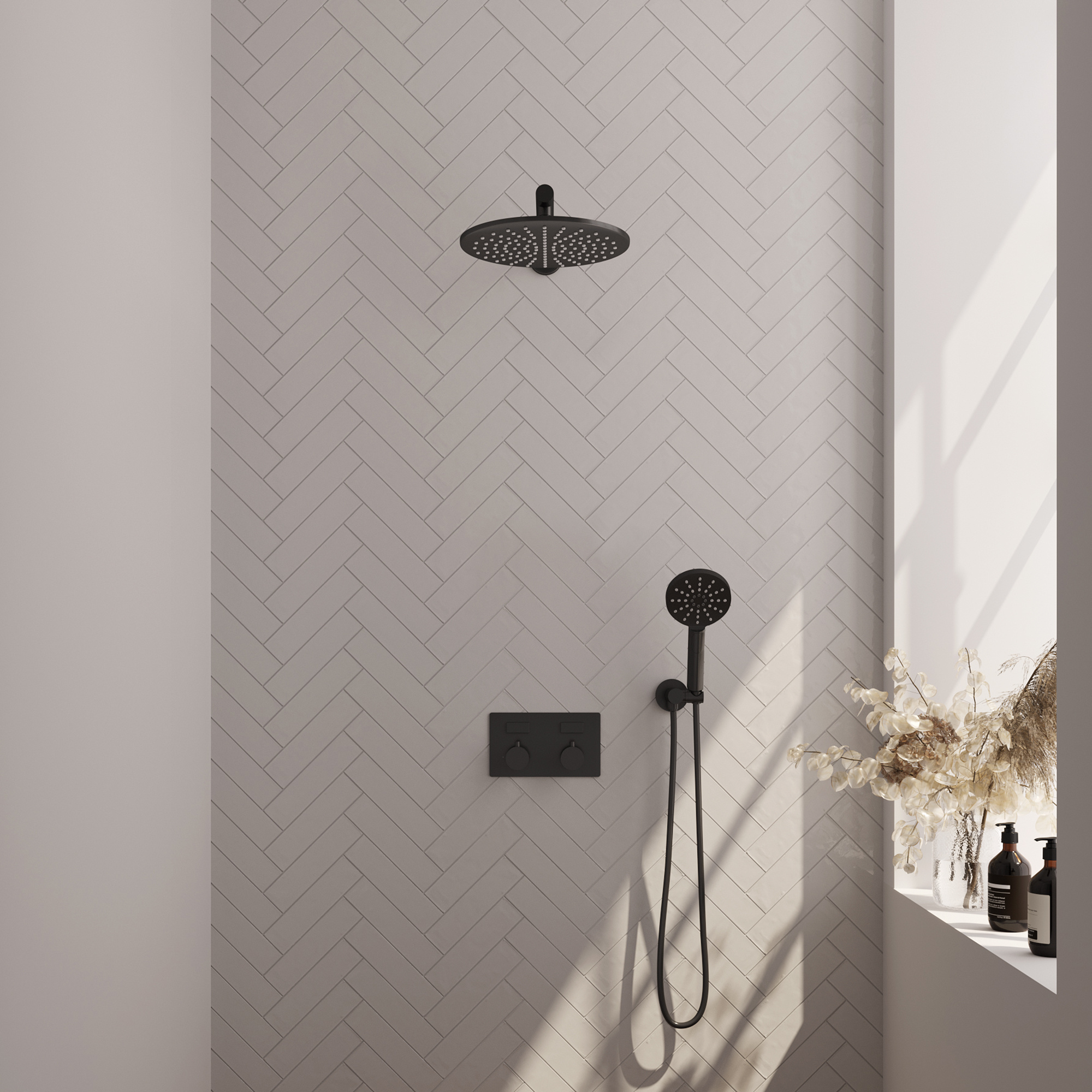 Brauer Black Editon Regendoucheset: Thermostatische Inbouwkraan met Drukknoppen, Rechte Wandarm, Douchekop 30cm, Wandhouder met Wateruitlaat, 3-Standen Handdouche & Doucheslang - Set 56 - Draaiknoppen - Mat Zwart