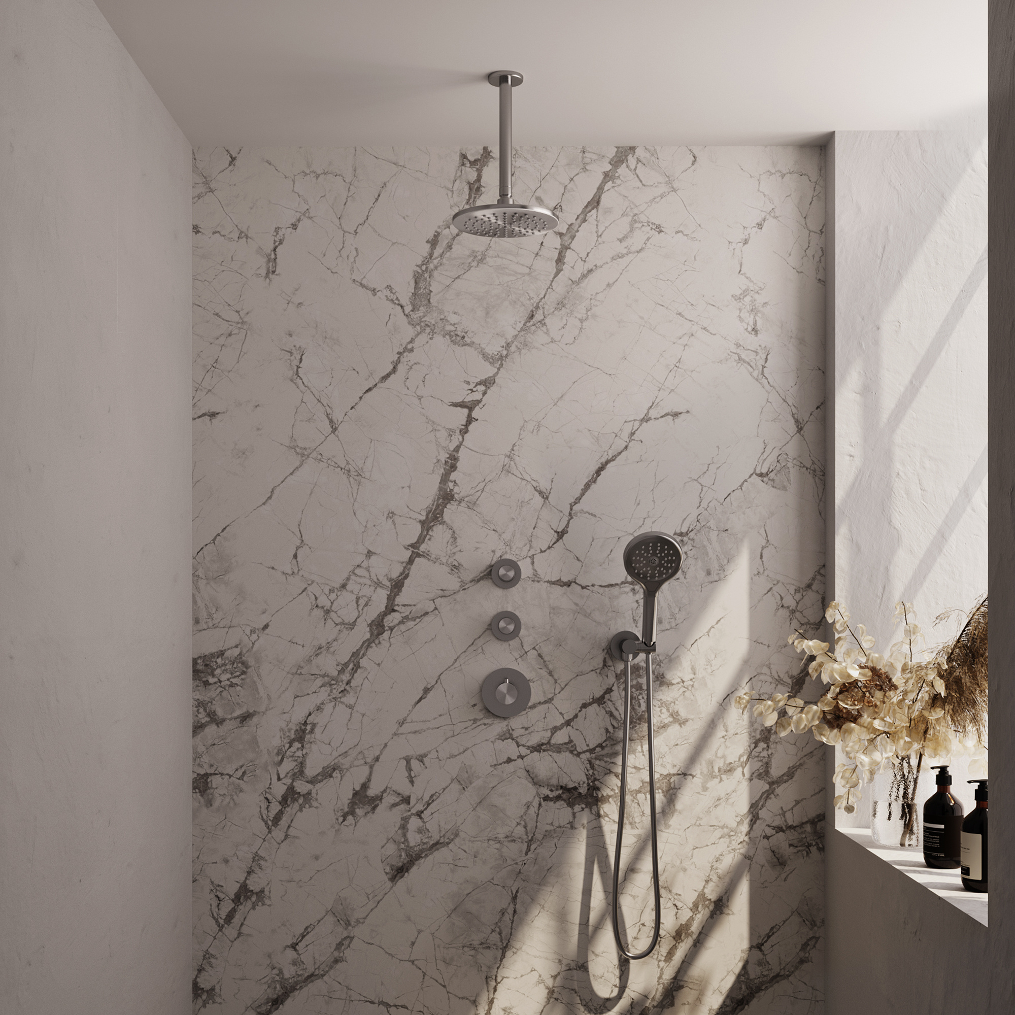Op zoek naar een hoofd- en handdouche die tegelijkertijd te gebruiken zijn? Dat kan met deze sets! Stopkranen kunnen onafhankelijk van elkaar worden bedient. In de sets wordt gebruik gemaakt van een complete inbouw thermostaat met stopkranen, welke op twee manieren kan worden ingebouwd. Een alternatieve plaatsing van de thermostaat en stopkranen, of het toevoegen van een derde of vierde stopkraan voor extra hoofd- en handdouches, is met deze sets niet mogelijk.