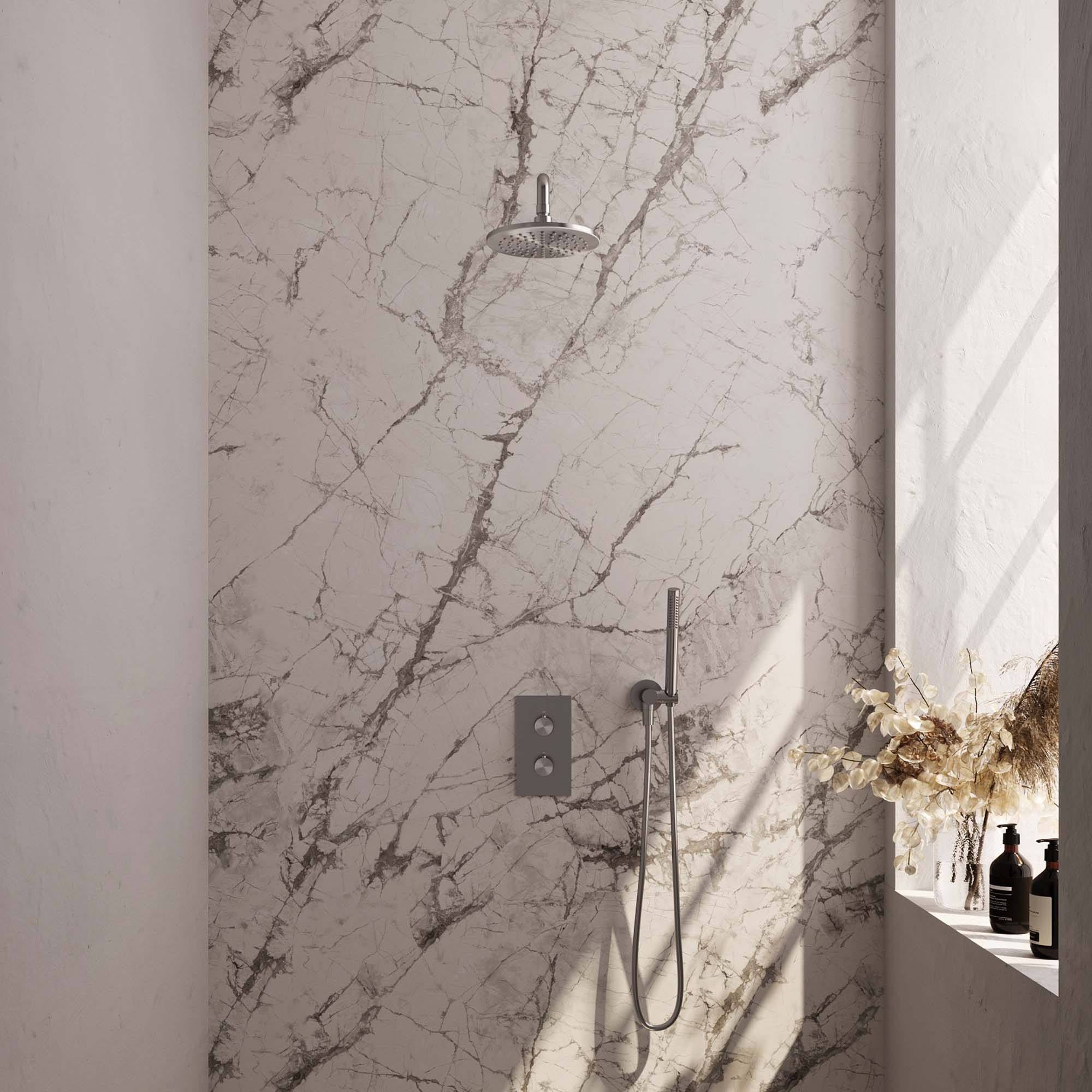 Onze thermostatische inbouw regendouches met 3-weg omstel zijn zeer gebruiksvriendelijk. Met de bovenste draaiknop switch je eenvoudig tussen hoofd- en handdouche, en met de onderste draaiknop is de temperatuur te regelen. Er zijn allerlei set-samenstellingen om uit te kiezen, gaat u voor een grote of kleinere regendouche, aan een plafond- of muurarm? En waar plaatst u uw handdouche het liefst in?