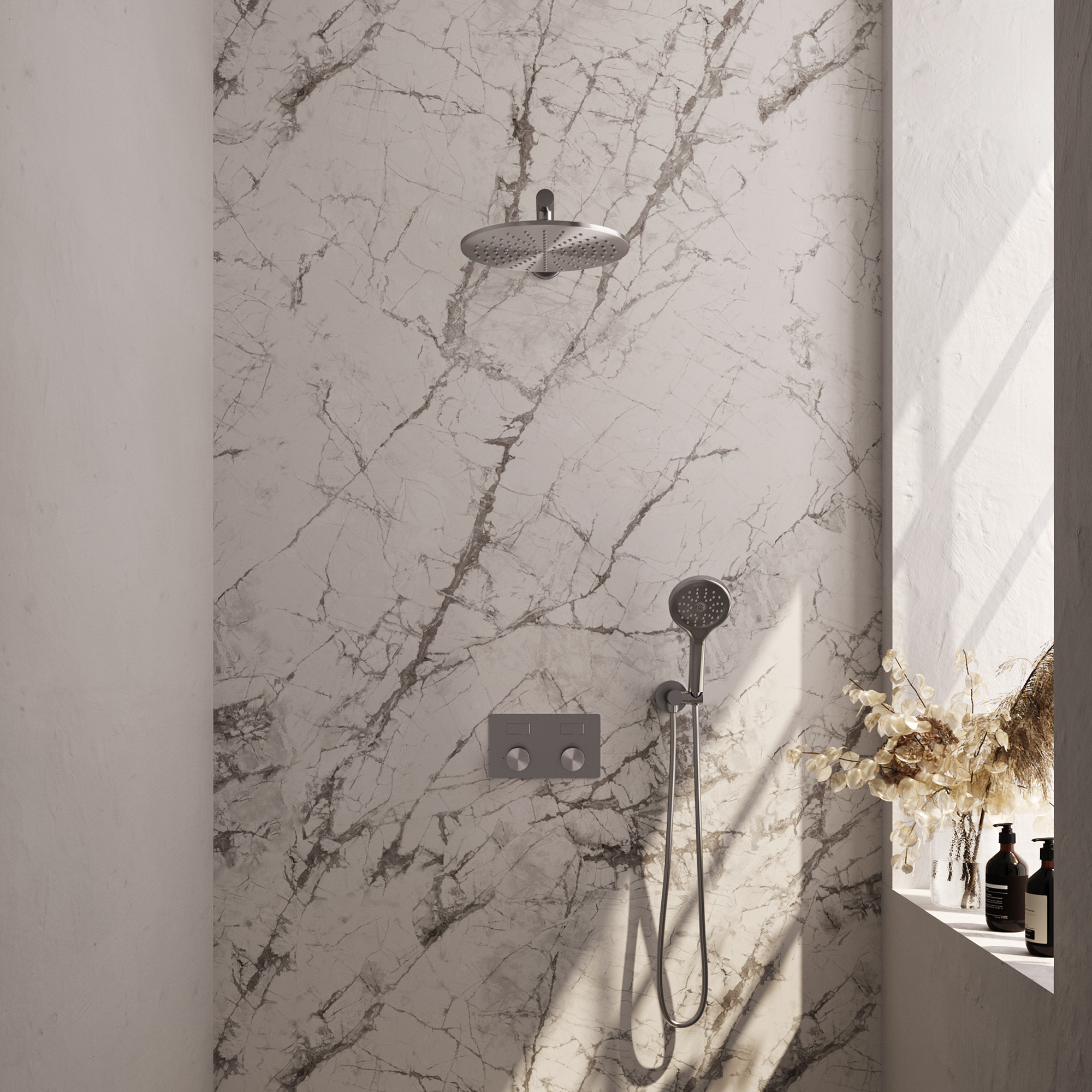In onze thermostatische inbouw regendouche met drukknoppen komt alles samen: moderne feeling, luxe uitstraling en fijne functies. De drukknoppen zijn handig in gebruik en met de drukregelaar stel je het watervolume naar wens in. Dat is vooral handig als de douche wordt gedeeld met een aantal gezinsleden, iedereen kan de hoeveelheid water die de kraan geeft makkelijk zelf bepalen. Ideaal in deze tijd waarin duurzaamheid een belangrijk thema is, en bij de een meer leeft dan bij de ander.