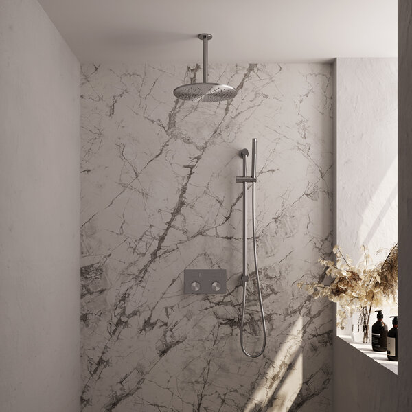 In onze thermostatische inbouw regendouche met drukknoppen komt alles samen: moderne feeling, luxe uitstraling en fijne functies. De drukknoppen zijn handig in gebruik en met de drukregelaar stel je het watervolume naar wens in. Dat is vooral handig als de douche wordt gedeeld met een aantal gezinsleden, iedereen kan de hoeveelheid water die de kraan geeft makkelijk zelf bepalen. Ideaal in deze tijd waarin duurzaamheid een belangrijk thema is, en bij de een meer leeft dan bij de ander.