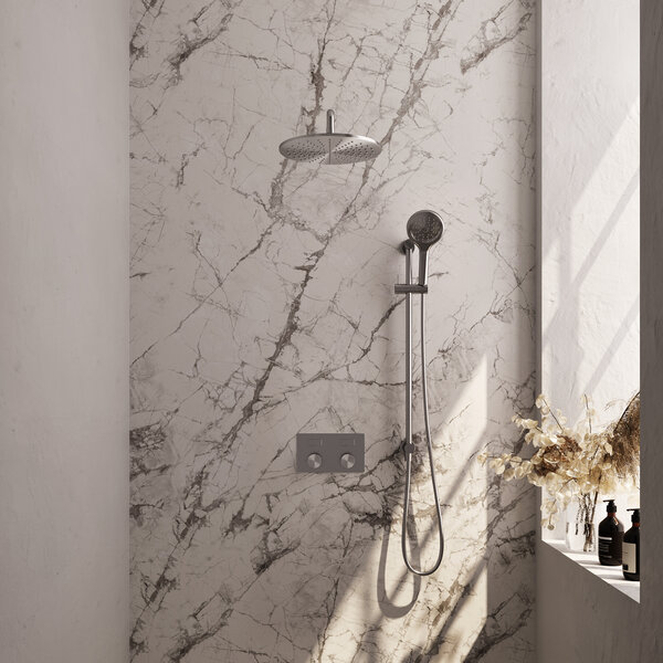 In onze thermostatische inbouw regendouche met drukknoppen komt alles samen: moderne feeling, luxe uitstraling en fijne functies. De drukknoppen zijn handig in gebruik en met de drukregelaar stel je het watervolume naar wens in. Dat is vooral handig als de douche wordt gedeeld met een aantal gezinsleden, iedereen kan de hoeveelheid water die de kraan geeft makkelijk zelf bepalen. Ideaal in deze tijd waarin duurzaamheid een belangrijk thema is, en bij de een meer leeft dan bij de ander.