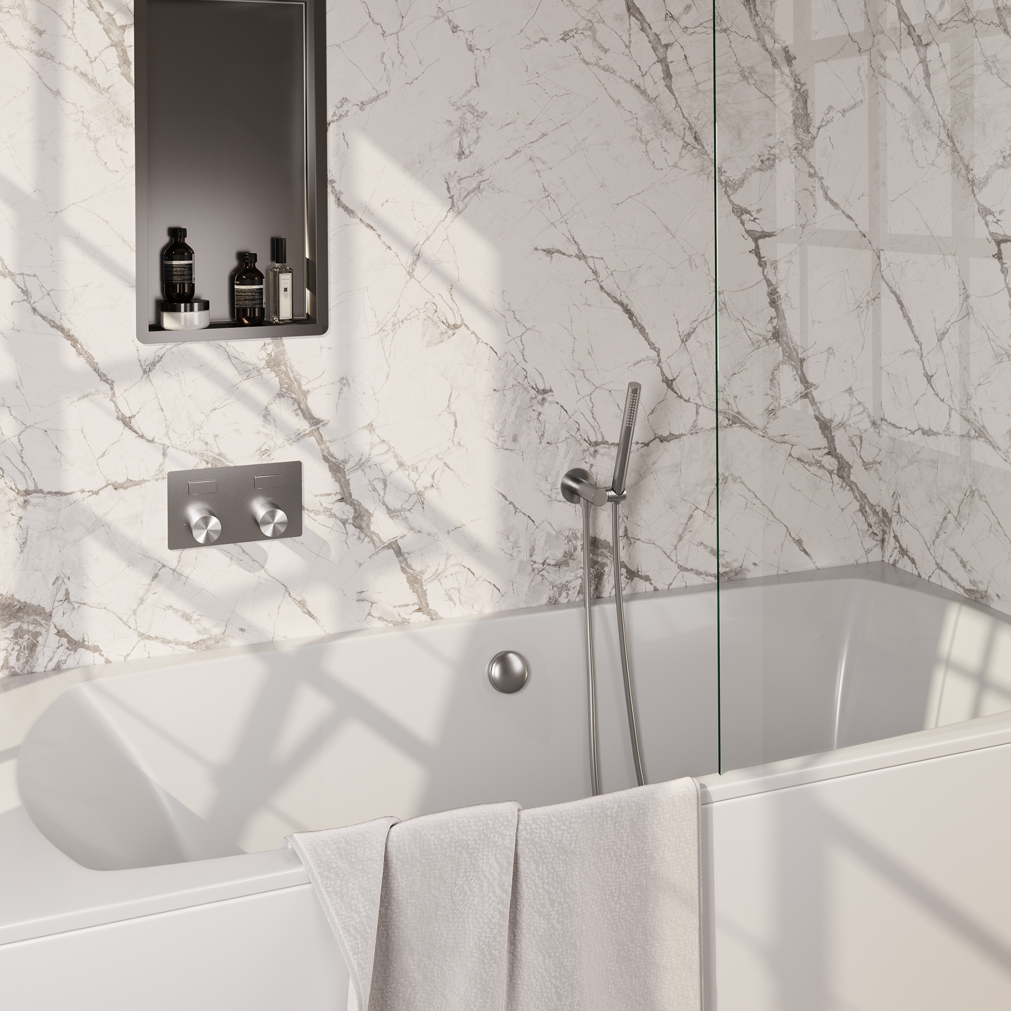De inbouw badkraan is verkrijgbaar met twee verschillende thermostaten, een thermostaat met stopkranen of een thermostaat met drukknoppen. Daarnaast zijn er verschillende samenstellingen verkrijgbaar: met een staaf handdouche, welke beschikt over een compacte harde straal, en met een 3-standen handdouche. De 3-standen handdouche heeft drie verschillende straalsoorten.