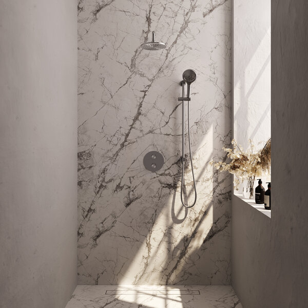 Onze Edition 3-weg thermostaat met ronde afdekplaat vind je terug in diverse complete sets! De thermostaat is eenvoudig te bedienen: met de bovenste draaiknop switch je eenvoudig tussen hoofd- en handdouche, en met de onderste draaiknop is de temperatuur te regelen. Er zijn allerlei set-samenstellingen om uit te kiezen, gaat u voor een grote of kleinere regendouche, aan een plafond- of muurarm? En waar plaatst u uw handdouche het liefst in?