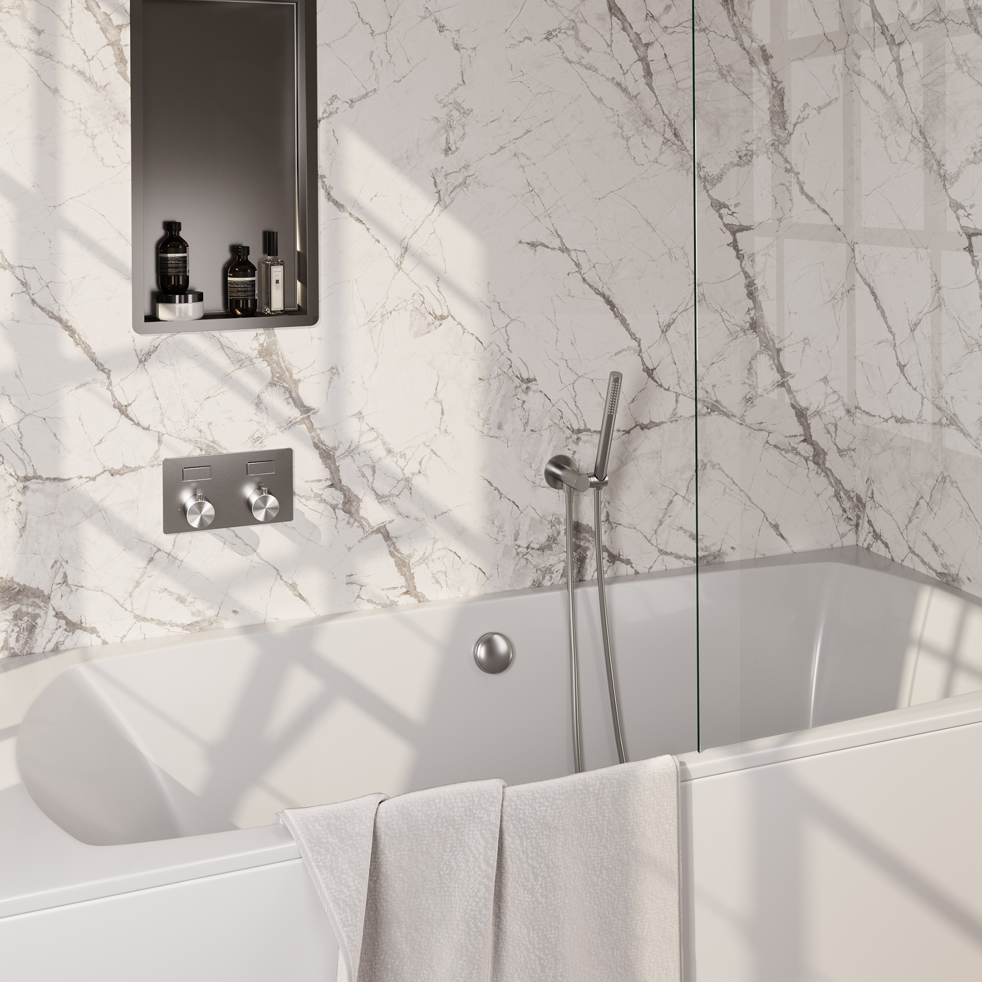 Bij onze thermostatische inbouw badkraan met badvulcombinate is jouw bad vuller strak weggewerkt in het ronde element op het bad. Verkrijgbaar met een staaf handdouche, welke