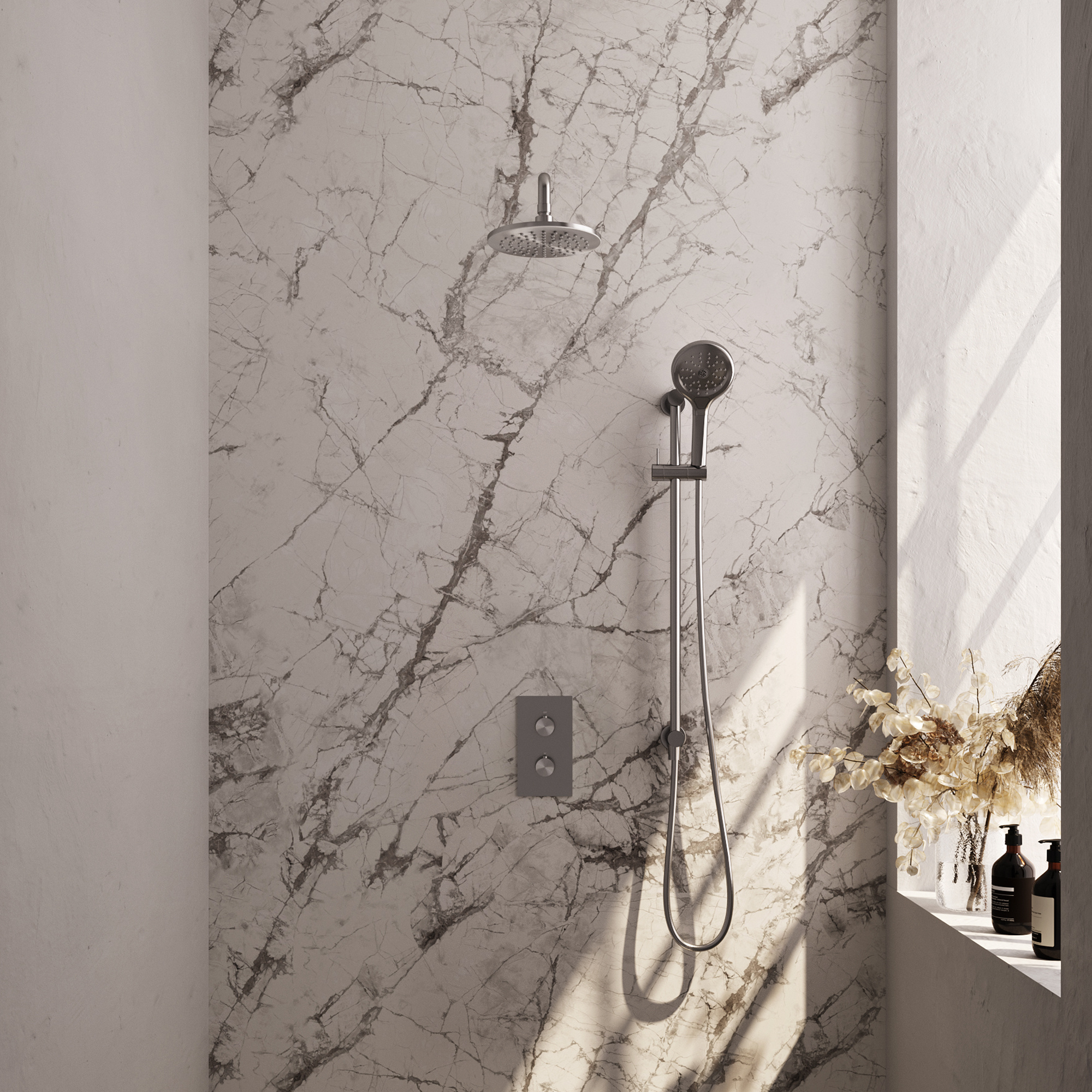 Onze thermostatische inbouw regendouches met 3-weg omstel zijn zeer gebruiksvriendelijk. Met de bovenste draaiknop switch je eenvoudig tussen hoofd- en handdouche, en met de onderste draaiknop is de temperatuur te regelen.