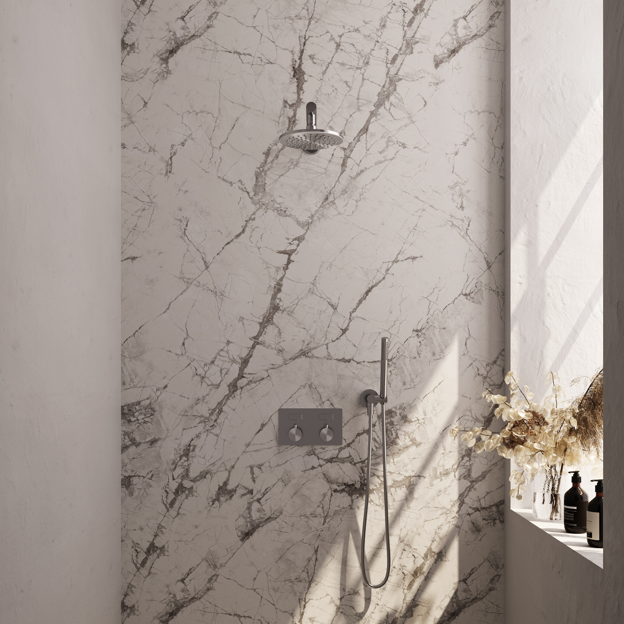 In onze thermostatische inbouw regendouche met drukknoppen komt alles samen: moderne feeling, luxe uitstraling en fijne functies. De drukknoppen zijn handig in gebruik en met de drukregelaar stel je het watervolume naar wens in. Dat is vooral handig als de douche wordt gedeeld met een aantal gezinsleden, iedereen kan de hoeveelheid water die de kraan geeft makkelijk zelf bepalen. Ideaal in deze tijd waarin duurzaamheid een belangrijk thema is, en bij de een meer leeft dan bij de
