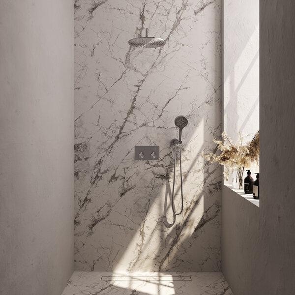 In onze thermostatische inbouw regendouche met drukknoppen komt alles samen: moderne feeling, luxe uitstraling en fijne functies. De drukknoppen zijn handig in gebruik en met de drukregelaar stel je het watervolume naar wens in. Dat is vooral handig als de douche wordt gedeeld met een aantal gezinsleden, iedereen kan de hoeveelheid water die de kraan geeft makkelijk zelf bepalen. Ideaal in deze tijd waarin duurzaamheid een belangrijk thema is, en bij de een meer leeft dan bij de