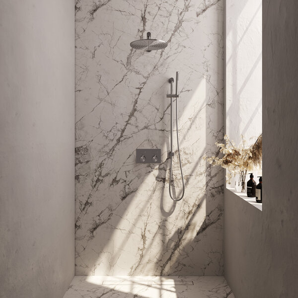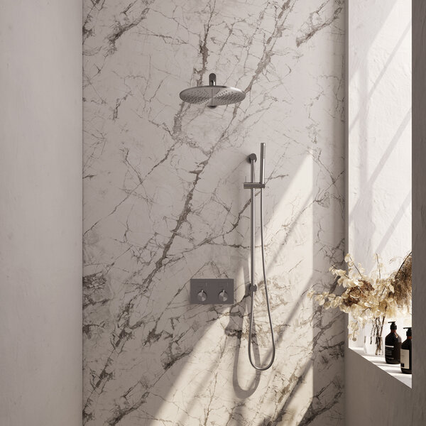 In onze thermostatische inbouw regendouche met drukknoppen komt alles samen: moderne feeling, luxe uitstraling en fijne functies. De drukknoppen zijn handig in gebruik en met de drukregelaar stel je het watervolume naar wens in. Dat is vooral handig als de douche wordt gedeeld met een aantal gezinsleden, iedereen kan de hoeveelheid water die de kraan geeft makkelijk zelf bepalen. Ideaal in deze tijd waarin duurzaamheid een belangrijk thema is, en bij de een meer leeft dan bij de