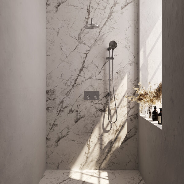 In onze thermostatische inbouw regendouche met drukknoppen komt alles samen: moderne feeling, luxe uitstraling en fijne functies. De drukknoppen zijn handig in gebruik en met de drukregelaar stel je het watervolume naar wens in. Dat is vooral handig als de douche wordt gedeeld met een aantal gezinsleden, iedereen kan de hoeveelheid water die de kraan geeft makkelijk zelf bepalen. Ideaal in deze tijd waarin duurzaamheid een belangrijk thema is, en bij de een meer leeft dan bij de
