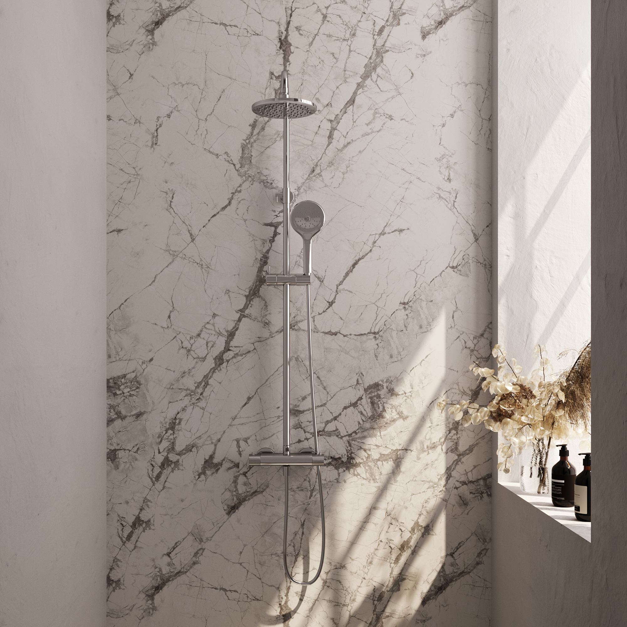 Genieten van een heerlijke douche ervaring? Ervaar dan onze thermostatische opbouw regendouche! Er zijn verschillende sets verkrijgbaar. Kies uit een twintig of dertig centimeter regendouche. Verkrijgbaar met een een 3-standen handdouche. De 3-standen handdouche heeft drie verschillende straalsoorten: