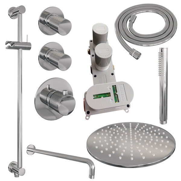 Brauer Chrome Carving Regendoucheset: Thermostatische Inbouwkraan met Stopkranen, Gebogen Wandarm, Douchekop 30cm, Glijstang met Wateruitlaat, Staafhanddouche & Doucheslang - Set 16 - Geribbeld Draaiknoppen - Chroom