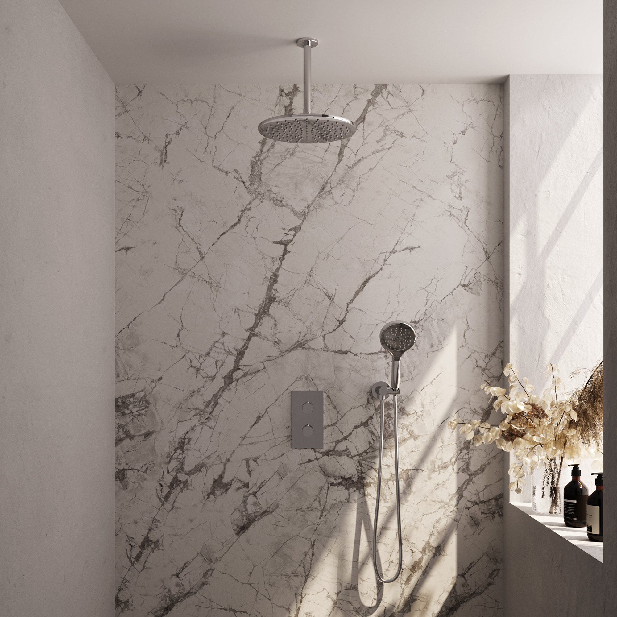 Onze thermostatische inbouw regendouches met 3-weg omstel zijn zeer gebruiksvriendelijk. Met de bovenste draaiknop switch je eenvoudig tussen hoofd- en handdouche, en met de onderste draaiknop is de temperatuur te regelen. Er zijn allerlei set-samenstellingen om uit te kiezen, gaat u voor een grote of kleinere regendouche, aan een plafond- of muurarm? En waar plaatst u uw handdouche het liefst in?