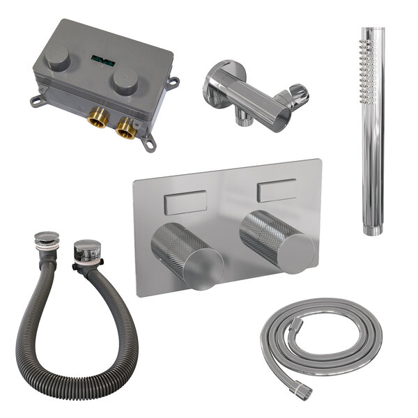 Brauer Chrome Carving Thermostatische Inbouw Badkraan met Omstel, Badvulcombinatie, Drukknoppen, Wandhouder met Wateruitlaat, Staafhanddouche & Doucheslang - Set 3 - Geribbeld Draaiknoppen - Chroom