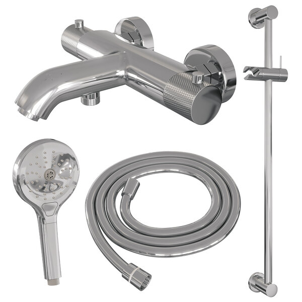 Brauer Chrome Carving Thermostatische Opbouw Badkraan met Omstel, Glijstang, 3-Standen Handdouche & Doucheslang - Set 2 - Geribbeld Draaiknoppen - Chroom