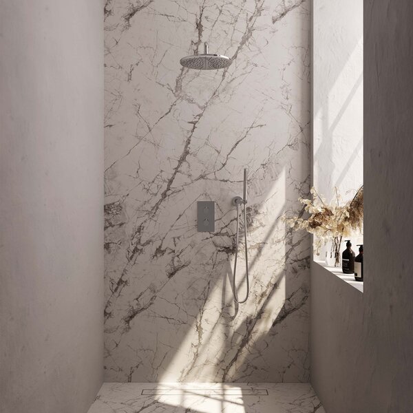 Onze thermostatische inbouw regendouches met 3-weg omstel zijn zeer gebruiksvriendelijk. Met de bovenste draaiknop switch je eenvoudig tussen hoofd- en handdouche, en met de onderste draaiknop is de temperatuur te regelen. Er zijn allerlei set-samenstellingen om uit te kiezen, gaat u voor een grote of kleinere regendouche, aan een plafond- of muurarm? En waar plaatst u uw handdouche het liefst in?