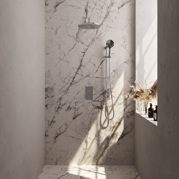 Onze thermostatische inbouw regendouches met 3-weg omstel zijn zeer gebruiksvriendelijk. Met de bovenste draaiknop switch je eenvoudig tussen hoofd- en handdouche, en met de onderste draaiknop is de temperatuur te regelen.