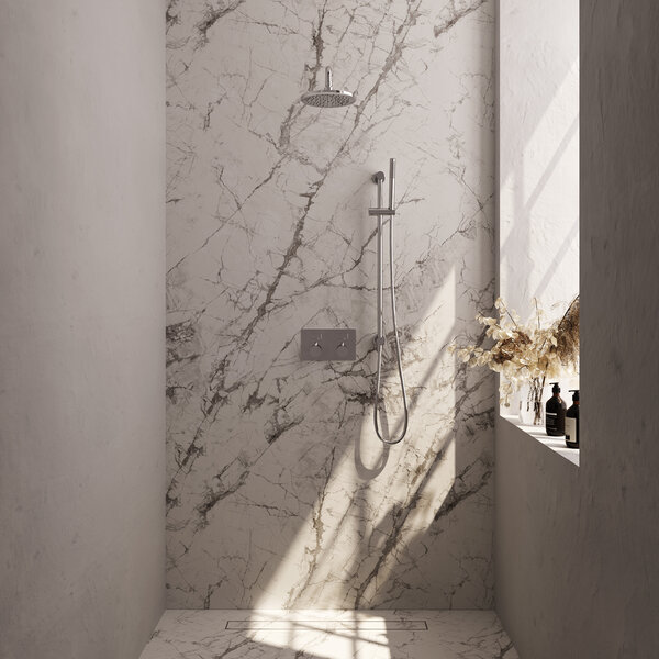 In onze thermostatische inbouw regendouche met drukknoppen komt alles samen: moderne feeling, luxe uitstraling en fijne functies. De drukknoppen zijn handig in gebruik en met de drukregelaar stel je het watervolume naar wens in. Dat is vooral handig als de douche wordt gedeeld met een aantal gezinsleden, iedereen kan de hoeveelheid water die de kraan geeft makkelijk zelf bepalen. Ideaal in deze tijd waarin duurzaamheid een belangrijk thema is, en bij de een meer leeft dan bij de