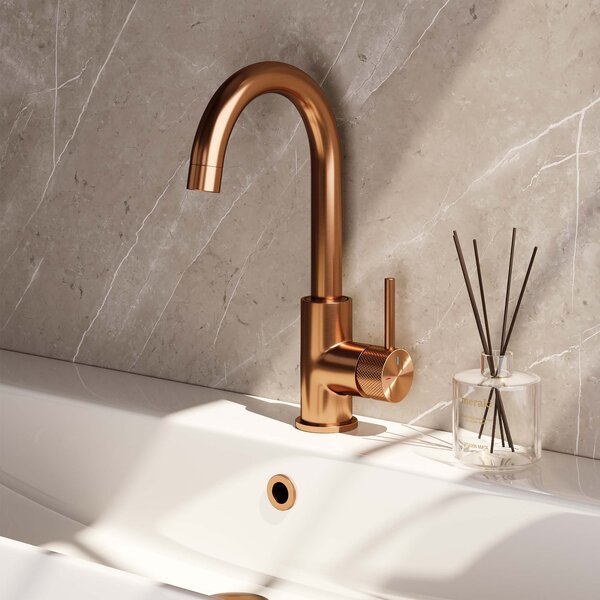 Brauer Copper Carving Opbouw Wastafelmengkraan met Draaibare Ronde Uitloop - Model A - Hoog - Geribbeld Hendel - PVD - PVD - Geborsteld Koper
