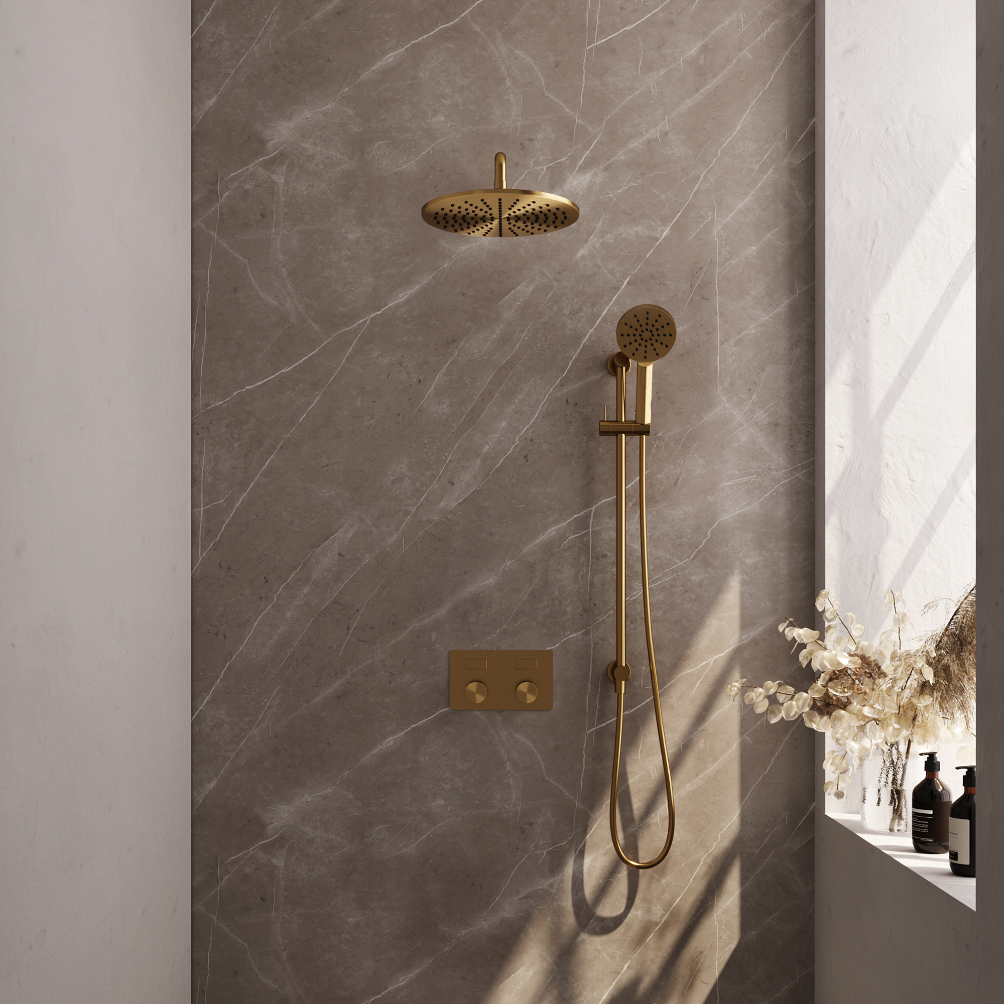 Brauer Gold Carving Regendoucheset: Thermostatische Inbouwkraan met Drukknoppen, Gebogen Wandarm, Douchekop 30cm, Glijstang met Wateruitlaat, 3-Standen Handdouche & Doucheslang - Set 70 - Geribbeld Draaiknoppen - PVD - Geborsteld Goud