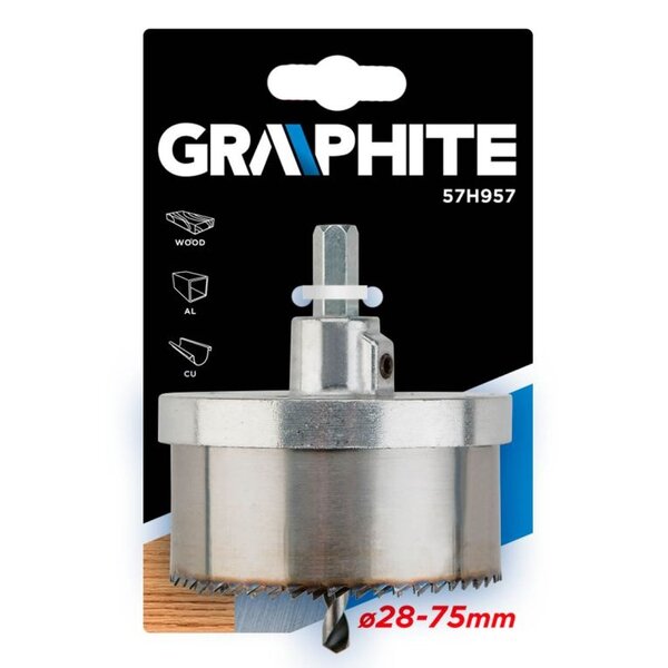 GRAPHITE stratenfreesset met geharde tanden in kroonbuizen, waarmee efficiënte gaten in hout, aluminium, koper, laminaat en kunststof kunnen worden geboord. Hoge sterkte van de gatenboren is mogelijk dankzij de bevestigingen van de bevestigingsschacht en schijfverankering aan de kroon van een enkel massief stuk metaal.