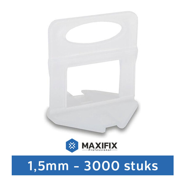 Zak met 3000 extra Maxifix Levelling clips, speciaal ontworpen voor de professional. Perfect als aanvulling op uw bestaande Maxifix Levelling Kit, of als reserve. De clips zijn van hoge kwaliteit en geschikt voor tegels met een dikte tussen 3 en 13 mm. Heeft u niet genoeg aan 100 stuks, dan zijn er ook grotere aantallen clips te verkrijgen. De Maxifix Levelling Clips kunnen als afstand houder worden gebruikt, en zorgen voor een voeg breedte van 1,5 mm.