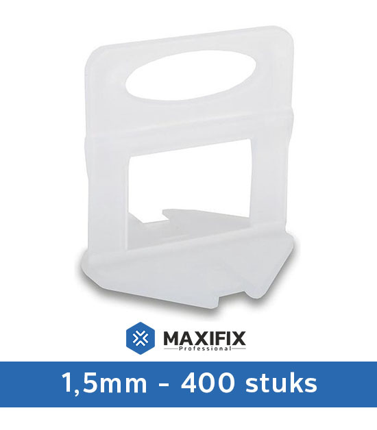 Zak met 400 extra Maxifix Levelling clips, speciaal ontworpen voor de professional. Perfect als aanvulling op uw bestaande Maxifix Levelling Kit, of als reserve. De clips zijn van hoge kwaliteit en geschikt voor tegels met een dikte tussen 3 en 13 mm. Heeft u niet genoeg aan 100 stuks, dan zijn er ook grotere aantallen clips te verkrijgen. De Maxifix Levelling Clips kunnen als afstand houder worden gebruikt, en zorgen voor een voeg breedte van 1,5 mm.