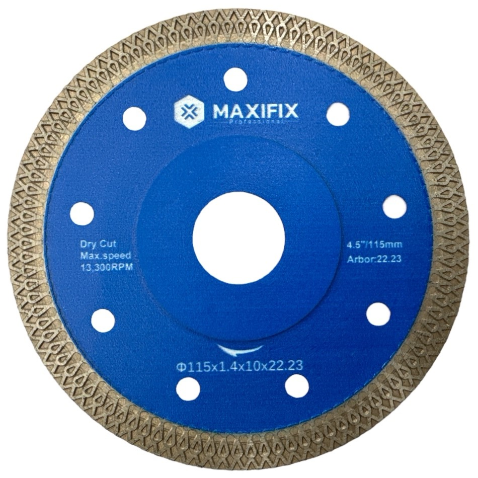 Maxifix Diamond Disk Premium 115 mm zaagblad voor het zagen van harde en dikke keramische tegels. Diamantschijf is geschikt voor het droog zagen met een haakse slijper. Het dunne diamantzaagblad is geschikt om op hoge snelheid te zagen met een haakse slijper en heeft een zeer fijne zaagsnede.