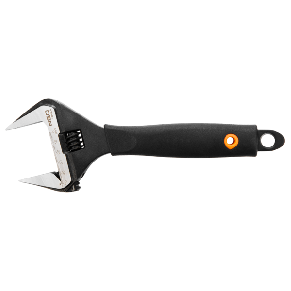 NEO Tools verstelbare sleutel is gemaakt uit duurzaam chroom-vanadiumstaal. Het besluit over een zeer groot aantal kakenversie. Het spreidbereik van de bek is 40% groter dan bij standaardsleutels. De verbrede en versmalde kop maakt het mogelijk om op moeilijk bereikbare plaatsen te werken. Ergonomische handgreep is gecoat met TPR-kunststof die bestand is tegen olie en vetten. Gereedschapskwaliteit bevestigd met TÜV-certificaat.