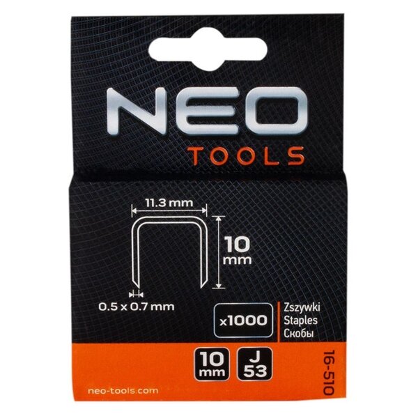 NEO Tools J-nietjes garanderen een veilige en stevige verbinding. Ze worden vaak gebruikt bij stoffering en decoratie. Nietjes zijn gegalvaniseerd, verbetering, met geslepen punten. Ze voldoen aan de hoogste normen voor professionele nietjes - hardheid, duurzaamheid, scherpte.