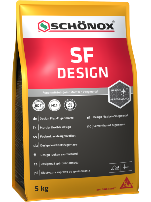 Design Flexibele Voegmortel vooral voor het voegen van grootformaat porcellanato grès, natuursteen en glaskeramiek voor binnen en buiten, wand en vloer. Verkrijgbaar in diverse kleuren. SCHÖNOX SF DESIGN is geoptimaliseerd voor een snelle verharding, heeft een verhoogde kleurstabiliteit, een zeer goede flankaanhechting alsook een verhoogde slijtvastheid.