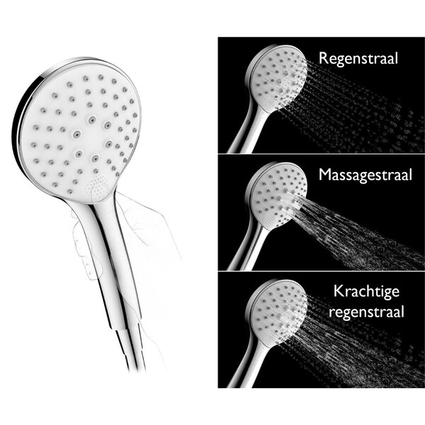 Door middel van een drukknop op de handdouche kun je kiezen tussen drie verschillende straalsoorten. Zo kan iedereen genieten van een comfortabel douche- of badmoment. Deze handdouche is gemaakt van kunstsof. Hierdoor is er minder kans op krassen en beschadigingen. Maak de handdouche af met een handdouchehouder en een doucheslang. Deze kun je los bij Wiesbaden Sanitair bestellen.